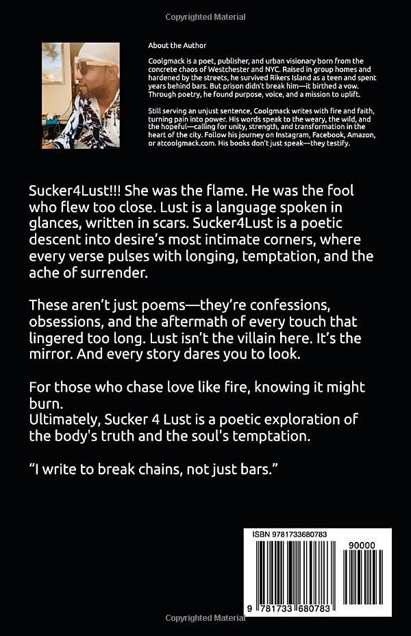 Sucker 4 Lust is a collection of erotic poetry that delves into the raw, uninhibited world of desire and passion. The book is a journey through lust, presented through two distinct perspectives—that of a young, confident man consumed by his hunger, and women drawn to his intense charisma.